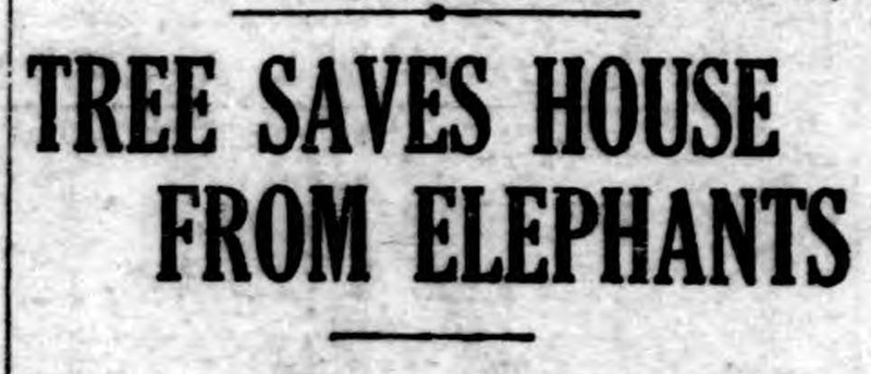 Another reason to plant trees: "Tree saves house from elephants."  From the Duluth Herald, 1910.