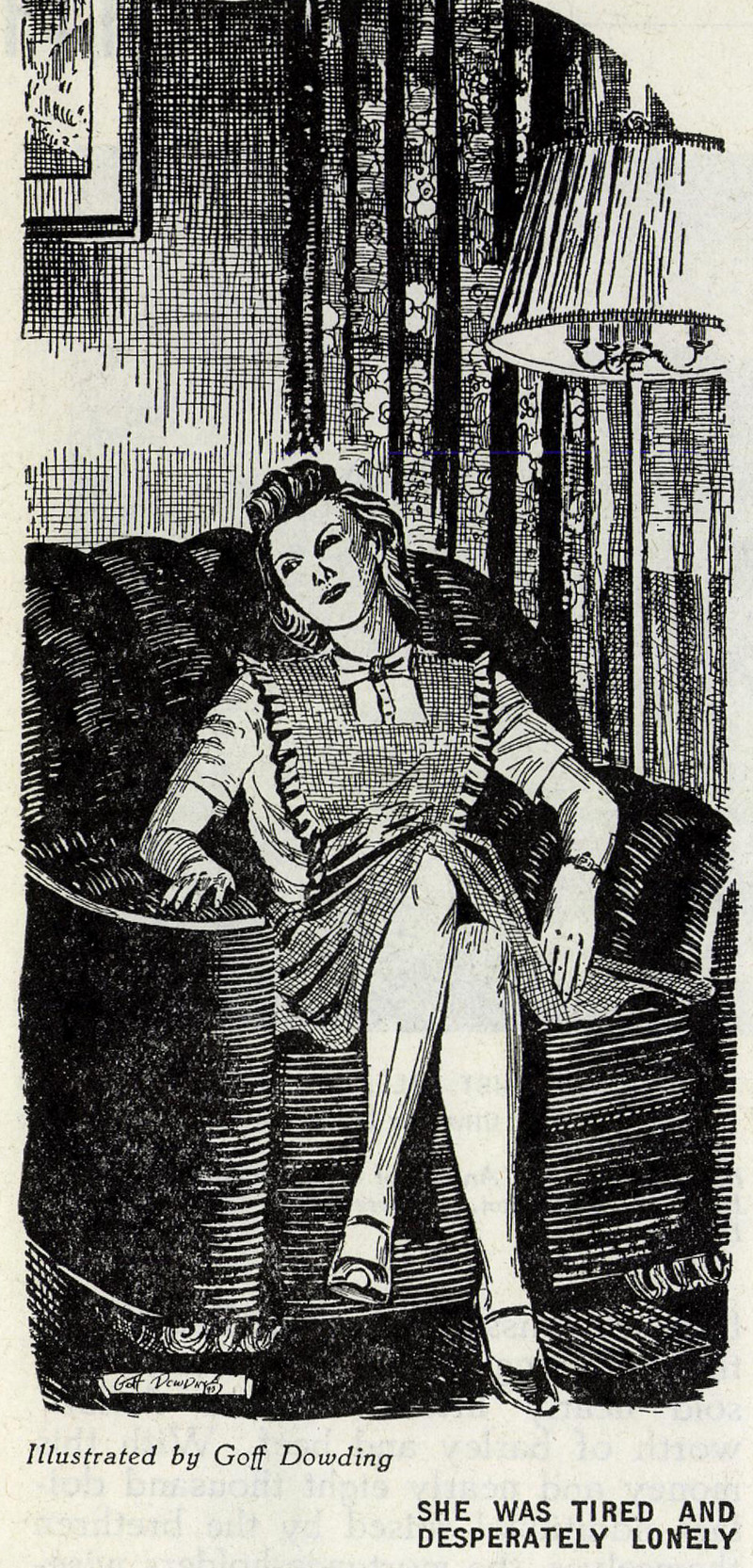 "She was tired and desperately lonely."  From Improvement Era, 1943.