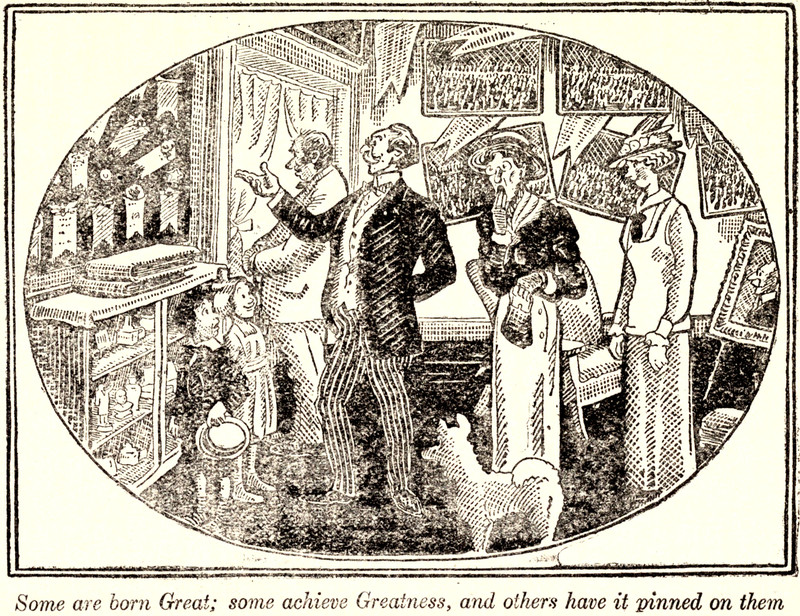"Some are born Great; some achieve Greatness, and other have it pinned on them." From Hand-Made Fables by George Ade and illustrated by John T. McCutcheon, 1920.