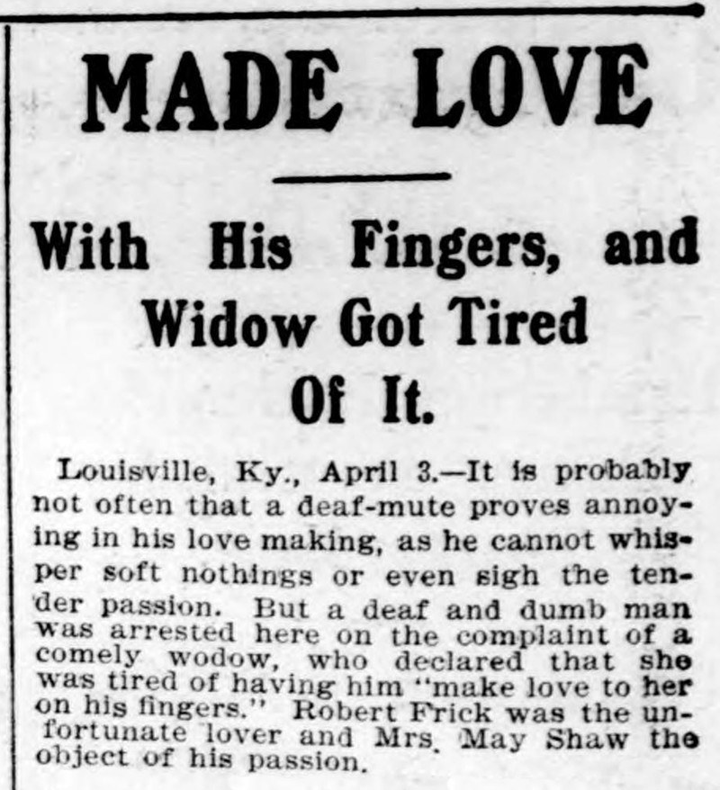 "Made love with his fingers, and widow got tired of it."  From the Duluth Evening Herald, 1902.