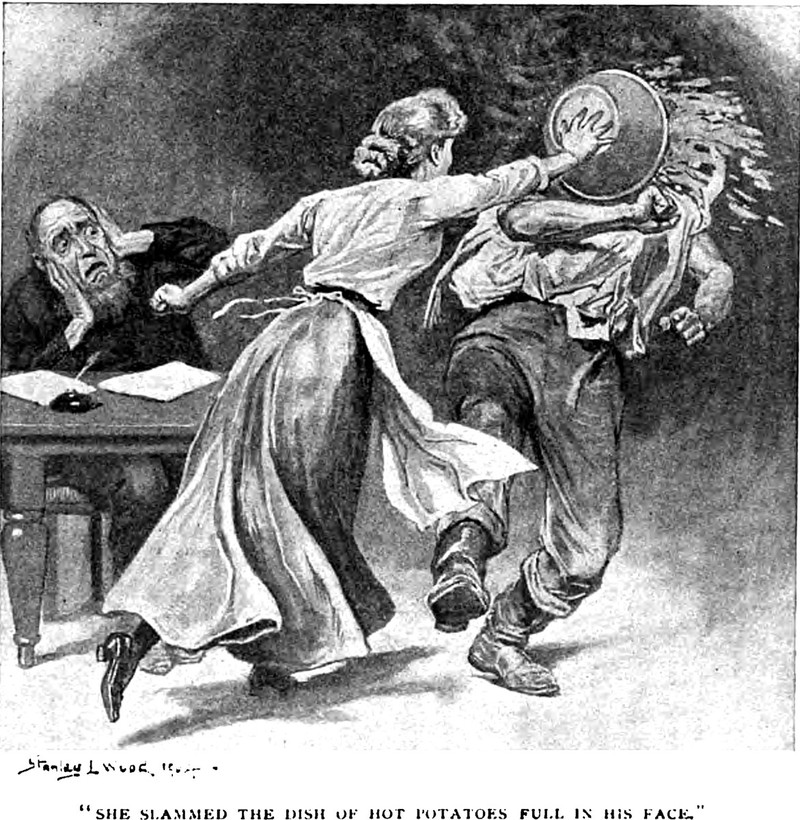 An illustration from a 1905 issue of Wide World magazine. The caption reads: "She slammed the dish of hot potatoes full in his face."