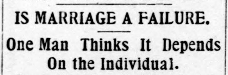 "Is marriage a failure.  One man thinks it depends on the individual."  From the Duluth Evening Herald, 1904.  See The Collected Lost Meanings of Wedlock.