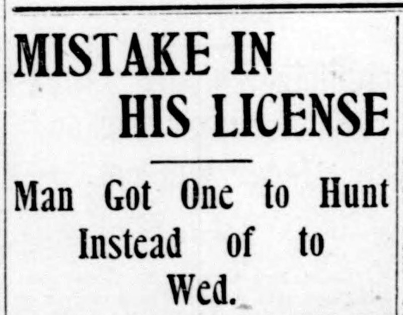 "Mistake in his license.  Man got one to hunt instead of to wed."  From the Duluth Evening Herald, 1904.  See The Collected Lost Meanings of Wedlock.