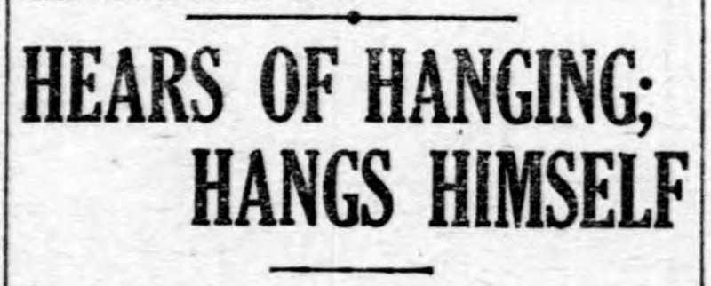 "Hears of hanging; hangs himself."  From the Duluth Herald, 1910.