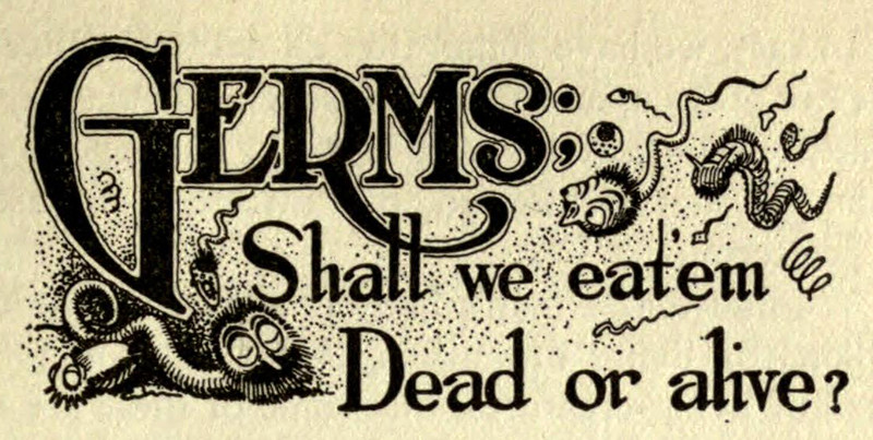 "Germs: shall we eat 'em dead or alive?"  From How to Live 100 Years by Guy Lockwood, 1912.
