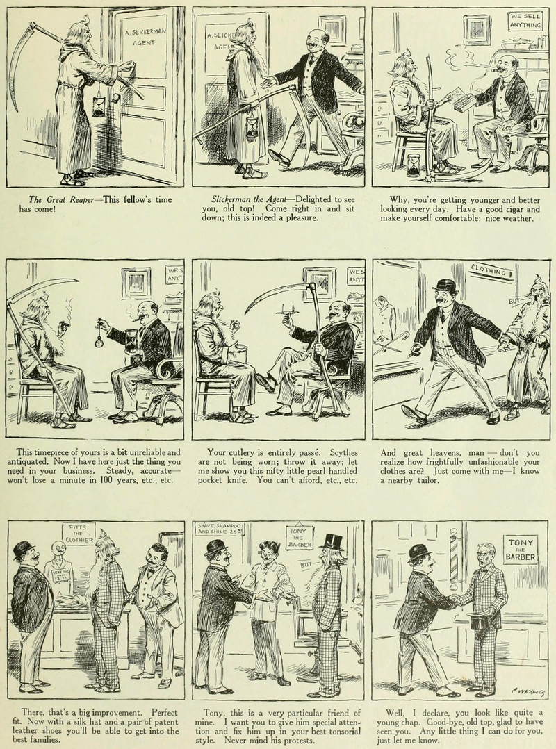 "Scythes are not being worn" this season.  How to trick the grim reaper, from Caricature, the Wit & Humor of a Nation In Picture, Song and Story, 1914.