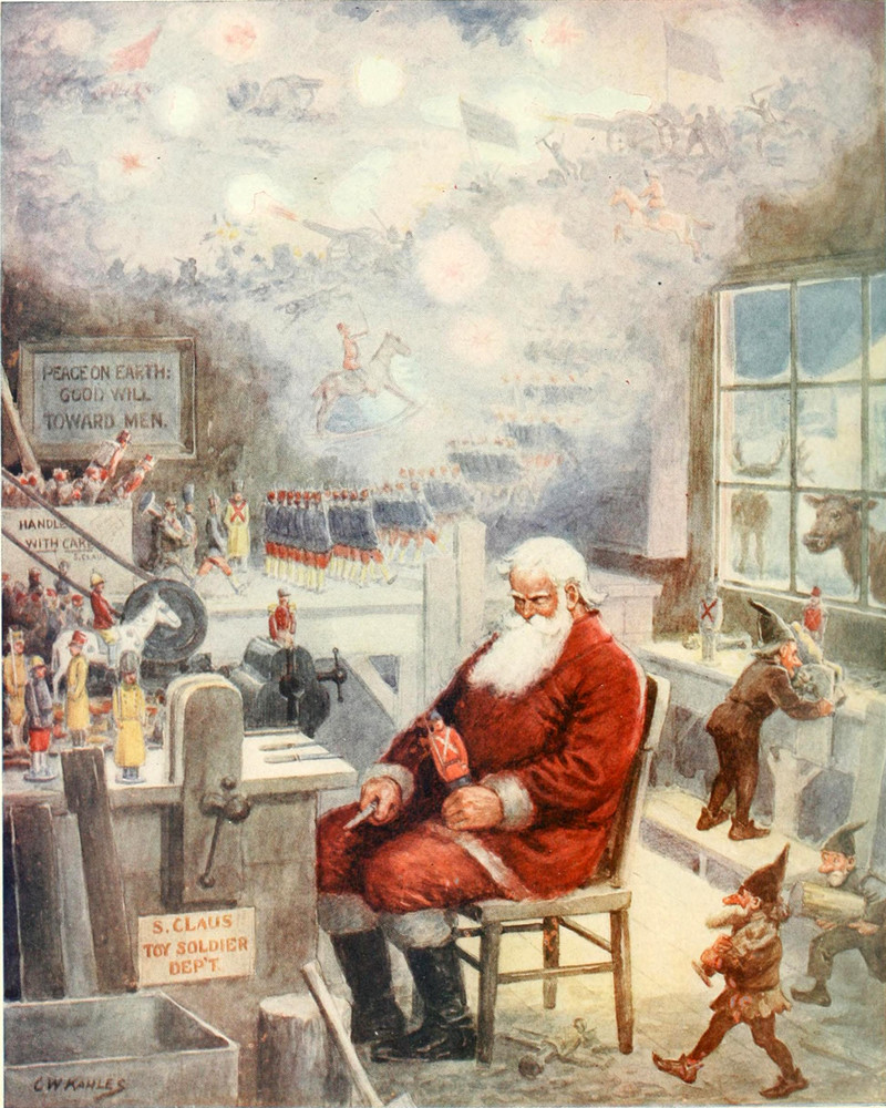 Santa dreams of his toy soldiers going to war.  From Caricature, the Wit & Humor of a Nation In Picture, Song and Story, 1914.