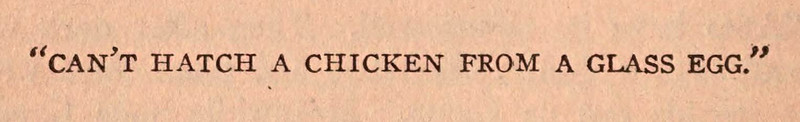 "Can't hatch a chicken from a glass egg."  From The Nine Unknown by Talbot Mundy, 1924.