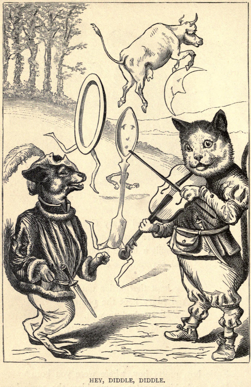 #vintage illustration #cow jumped over the moon #musical animal #1870s #illustration #nursery rhyme #cat and the fiddle