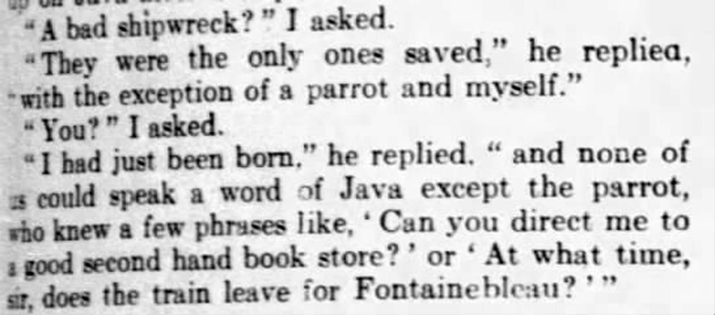 A parrot who could ask in Javanese, "Can you direct me to a good second hand book store?"  From the Chicago Tribune, 1926.  (Hat tip: Jonathan.)
