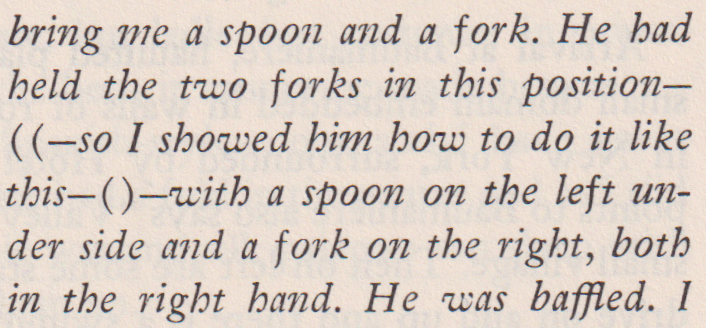 ***Most restaurants have their "good" and "bad" locations--a situation that could be avoided only by the installation of a revolving floor, on which each table in turn would be "good" and "bad."***[Bonus: Punctuation as Cutlery dept.]