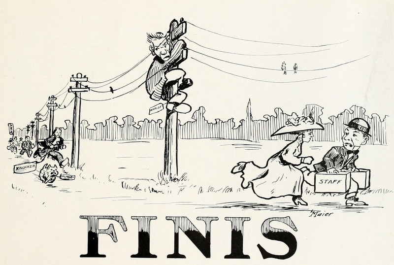 #vintage illustration #finis #vintage yearbook #yearbook #the end #telephone pole #illustration #up a tree