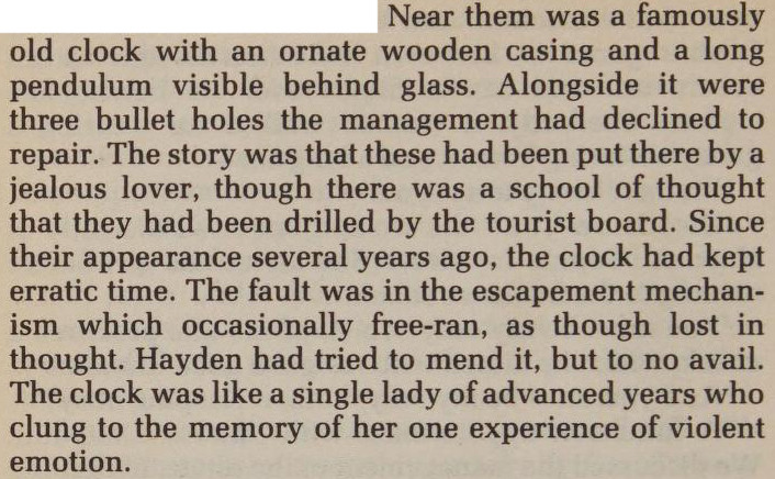 A clock with an escapement mechanism which occasionally free-ran, as though lost in thought.  From Jizz: The Story of a New Renaissance Man and the Riddle of Existence by John Hart, 1992.