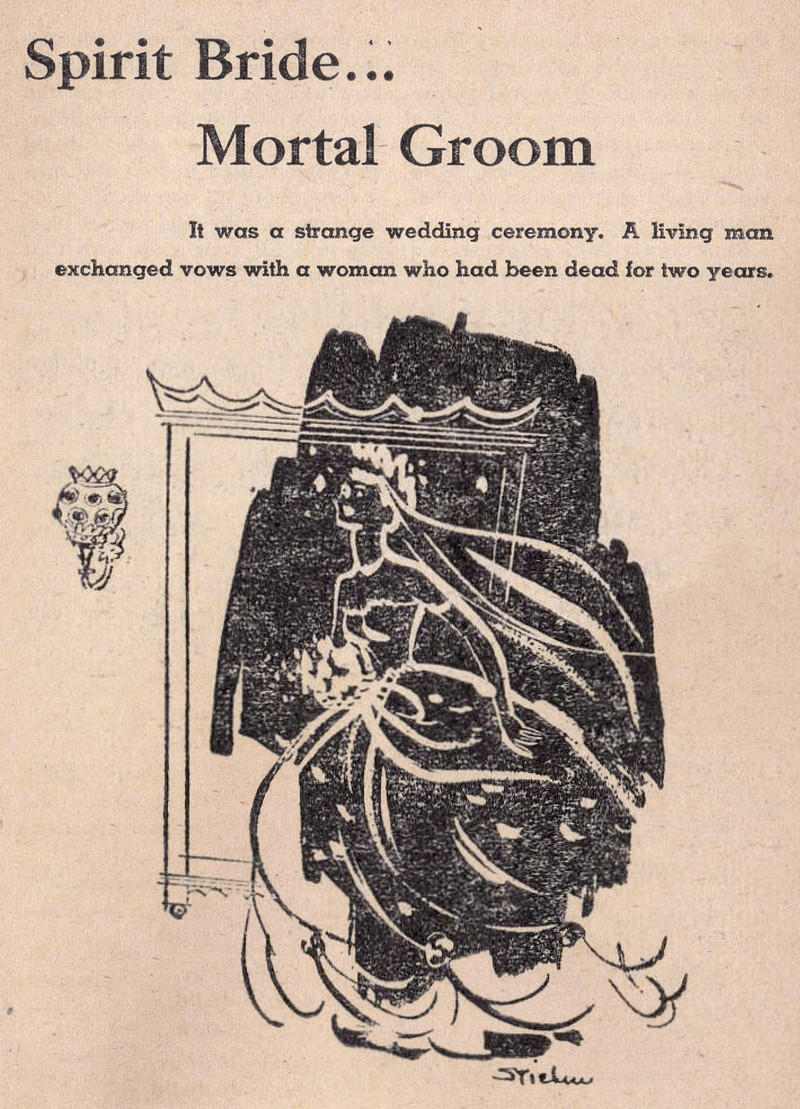 "Spirit bride ... mortal groom. It was a strange wedding ceremony. A living man exchanged vows with a woman who had been dead for two years." From Fate Magazine, 1956. See The Collected Lost Meanings of Wedlock.
