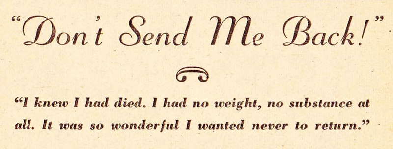 "Don't send me back!  I knew I had died.  I had no weight, no substance at all.  It was so wonderful I wanted never to return."  From Fate Magazine, 1954.