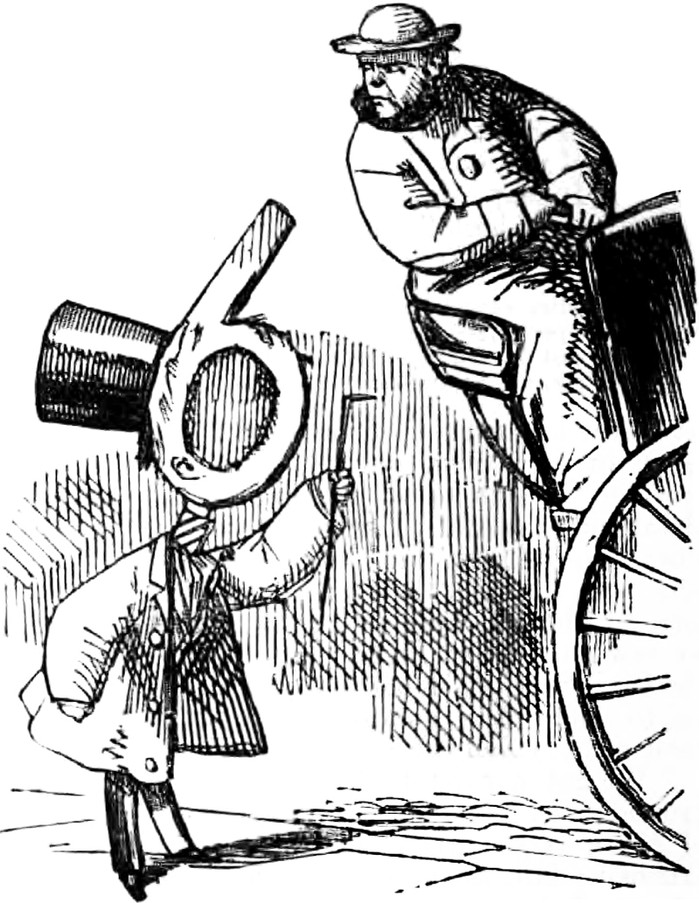 A precursor to the cult television series The Prisoner: Number Six hails a cab.  From Punch, 1853.