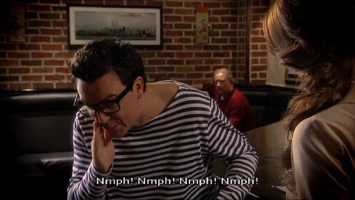 Nmph: the sound of swallowing a bug, in all-consonant glory.  From the genius Scotsmen of Burnistoun.