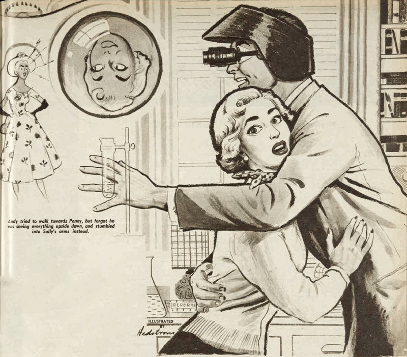 It's true -- when you forget you're seeing everything upside down, you can stumble into awkward situations. "Andy tried to walk towards Penny, but he forgot he was seeing everything upside down and stumbled into Sally's arms instead." From The Australian Women's Weekly, 1959.