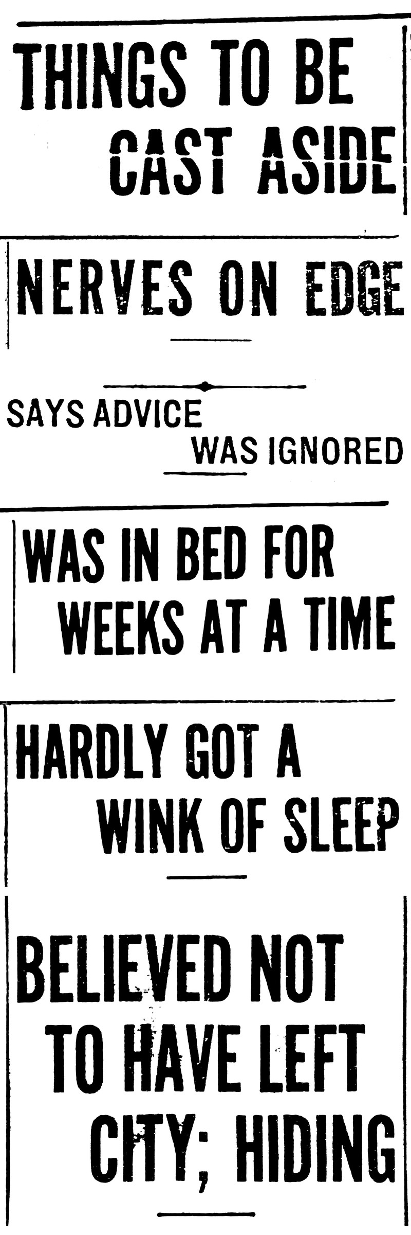 Hey, if casting things aside, nerves being on edge, having advice ignored, being in bed but not sleeping, and going into hiding is headline-worthy, why ain't my life a banner headline? Reblog if you, too, are the real news. From The Duluth Herald, 1920.