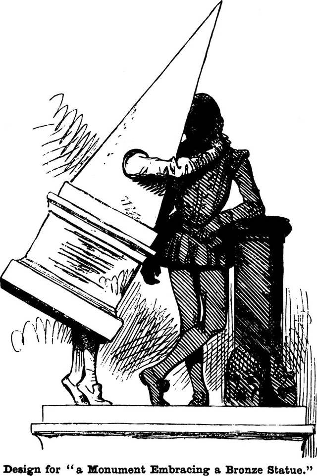 An illustration from an 1864 issue of Punch magazine.  The caption reads: "Design for 'a monument embracing a bronze statue.'"