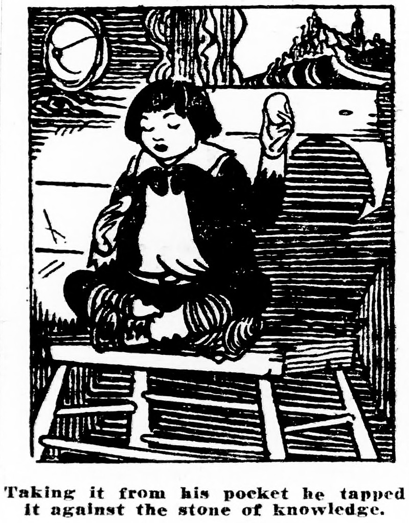 Tapping the stone of knowledge against the stone which admits one to the realm of the unseen.  From The Duluth Herald, 1920.