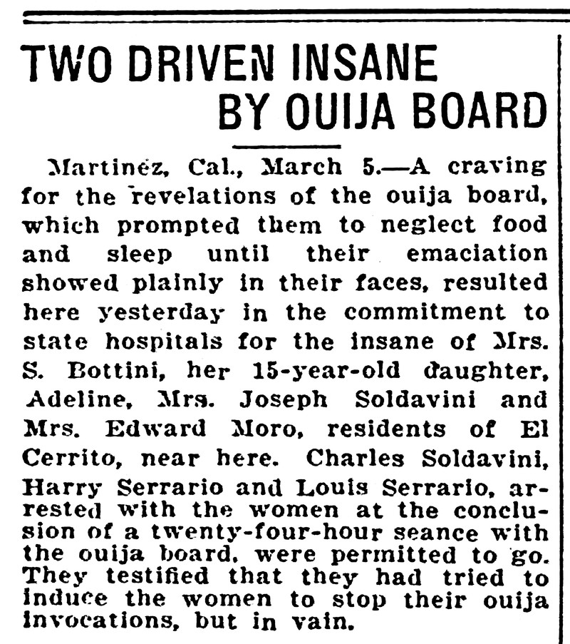 Though the headline says that two were driven insane by a ouija board, the article names four whose commitment to occult revelations led to their commitment to state hospitals for the insane. From