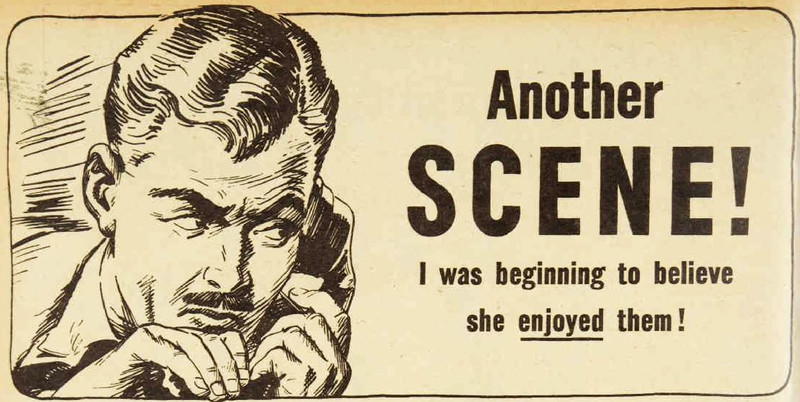 "Another scene!  I was beginning to believe she enjoyed them!"  From The Australian Women's Weekly, 1946.