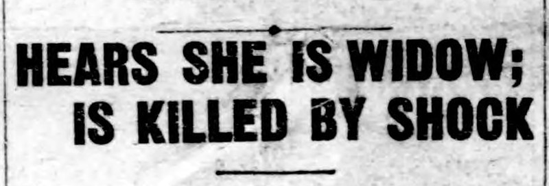 "Hears she is widow; is killed by shock."  From The Duluth Herald, 1914.
