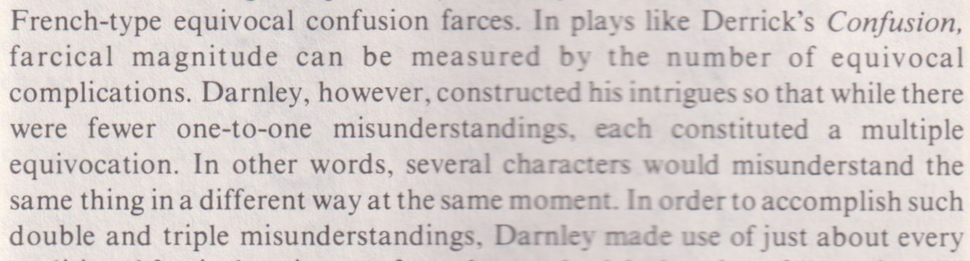 [A few more snippets attached--as you'll see, the farce scholar likes to do the math! It's also fun to encounter new-to-me terminology for familiar devices, e.g., "object-chase" and "parrot speech." Btw, I sought Confusion online and began reading it, but imo it didn't live up to this synopsis. As with Victorian farces I've explored in the past, the dramatis personae (including, in this instance, Mortimer Mumbleford, Christopher Blizzard, and Miss Lucretia Tickleby) were pretty much the highlight.]