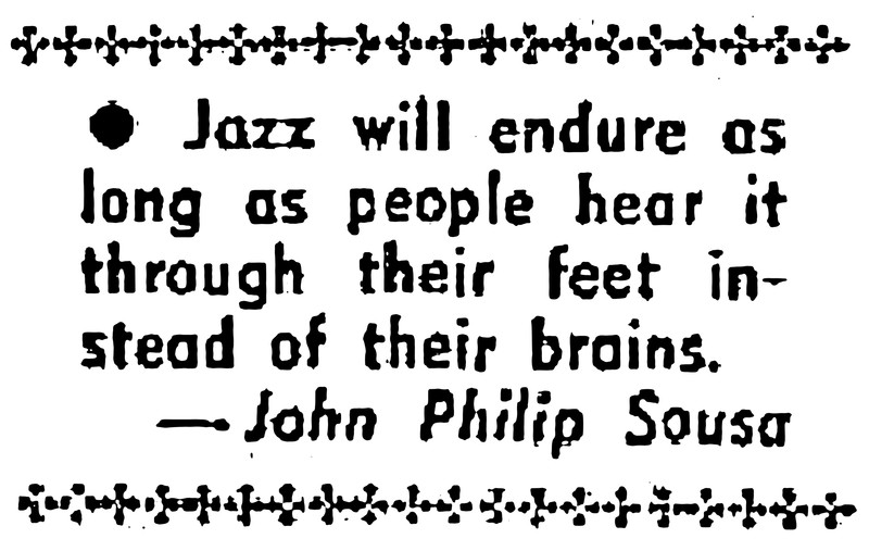 "Jazz will endure as long as people hear it through their feet instead of their brains" (John Philip Sousa).  From The Australian Women's Weekly, 1960.