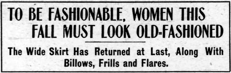 "To be fashionable, women this fall must look old-fashioned. The wide skirt has returned at last, along with billows, frills, and flares." From The Duluth Evening Herald, 1914.