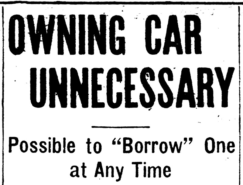 "Owning car unnecessary.  Possible to 'borrow' one at any time."  From The Duluth Evening Herald, 1915.