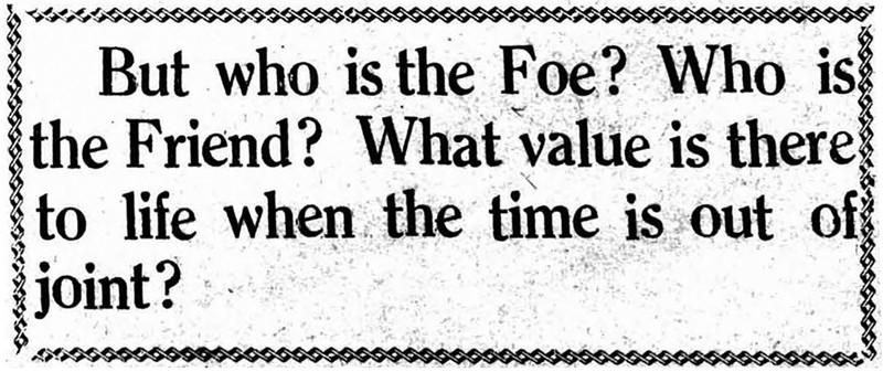 "But who is the Foe?  Who is the Friend?  What value is there to life when the time is out of joing?"  From the Bombay Sunday Chronicle, 1947.