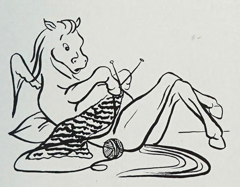 #vintage illustration #anthropomorphism #pegasus #vintage yearbook #yearbook #winged horse #knitting #illustration