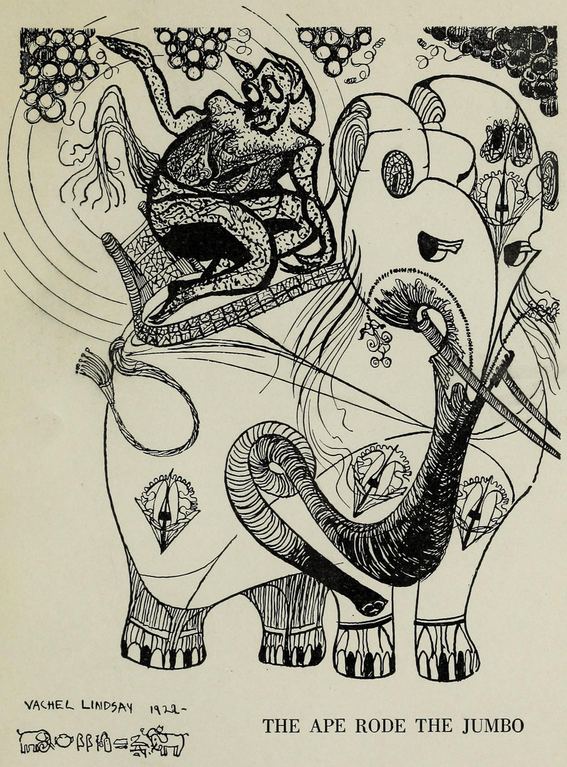 "The ape rode the jumbo."  From Going-To-The-Sun by Vachel Lindsay, 1923.