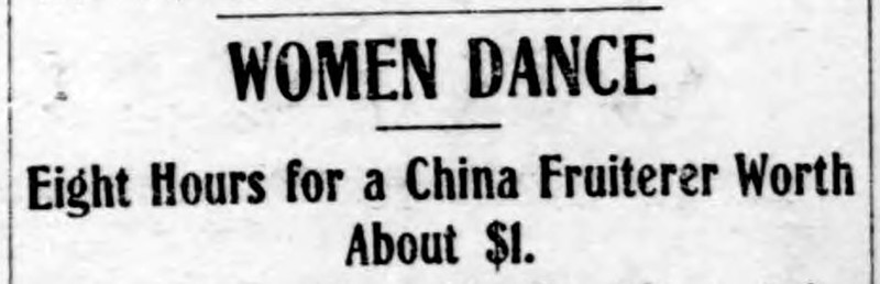 "Women dance eight hours for a china fruiterer worth about $1." From the Duluth Evening Herald, 1905. (In all fairness, the item would be worth about $34 in today's dollars.)