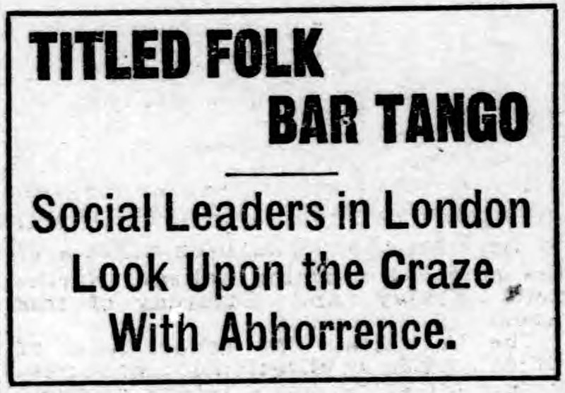 "Social leaders in London look upon the [tango] craze with abhorrence."  From the Duluth Evening Herald, 1914.