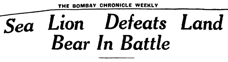 "Sea lion defeats land bear in battle."  From the Bombay Sunday Chronicle, 1952.