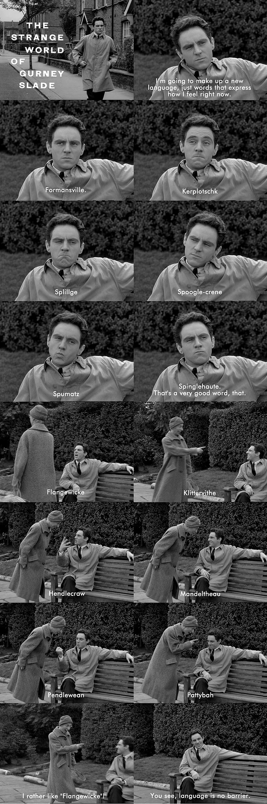 The DVD release of Anthony Newley's series The Strange World of Gurney Slade doesn't feature subtitles, so we took it upon ourselves to transliterate the following rather marvelous made-up words: