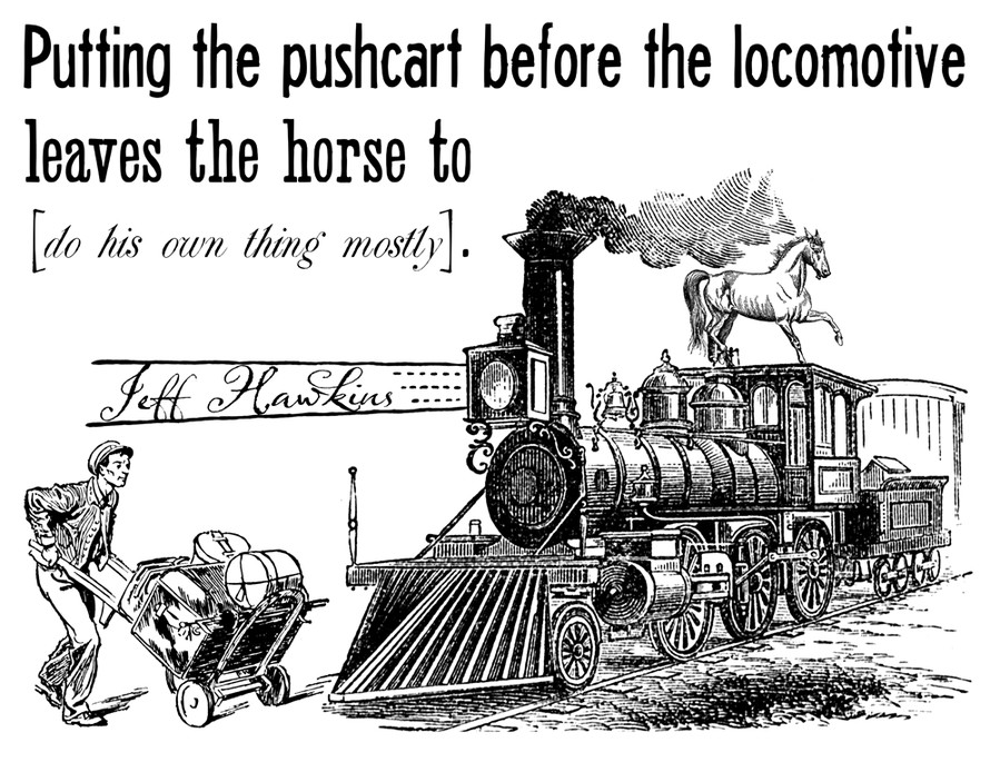 The text reads: "Putting the pushcart before the locomotive leaves the horse to [do his own thing mostly]." —Jeff Hawkins