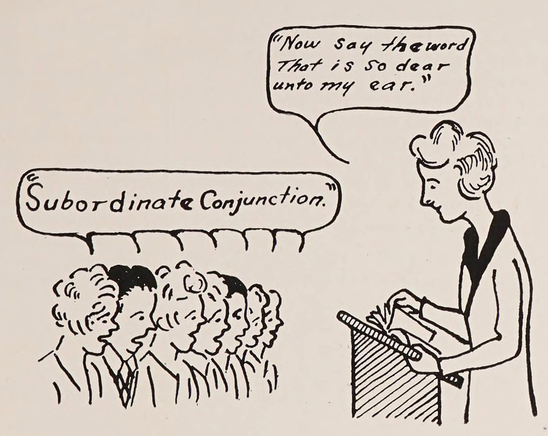 "Now say the word that is so dear unto my ear."  "Subordinate conjunction."  From Nebraska Wesleyan University's 1931 yearbook.