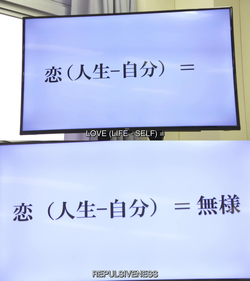 Love times life minus self equals repulsiveness.  From How to Eliminate My Teacher (2020)