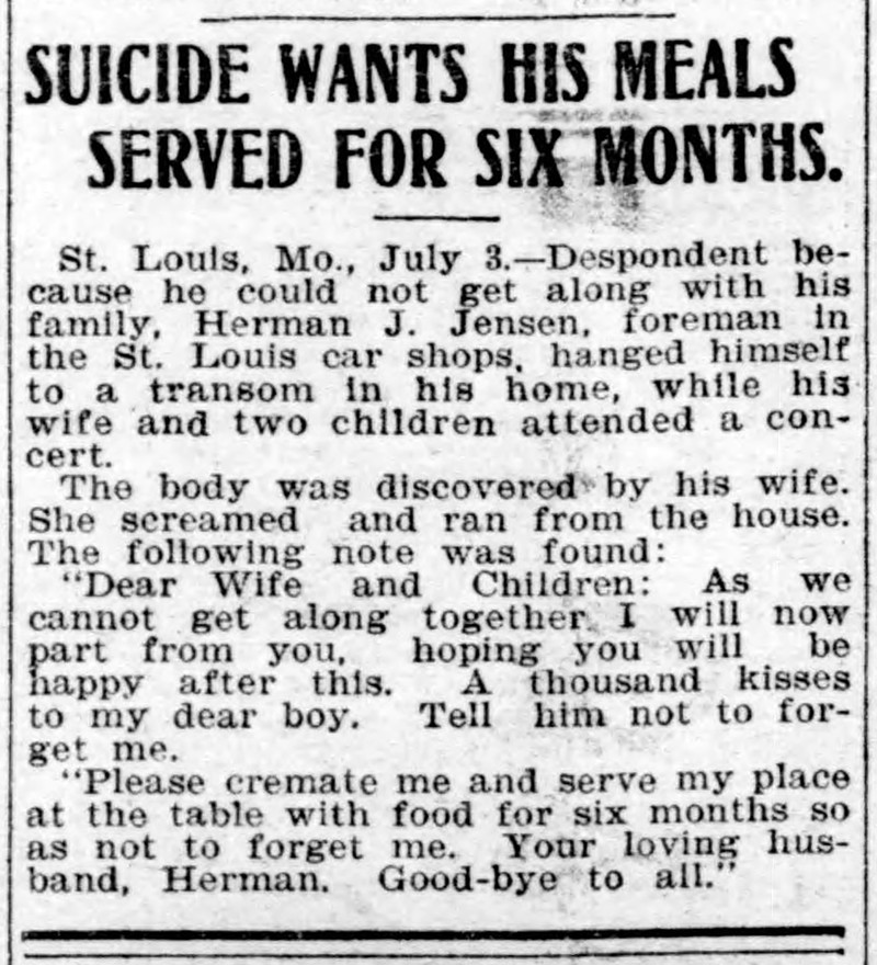 "Suicide wants his meals served for six months."  From the Duluth Evening Herald, 1906.