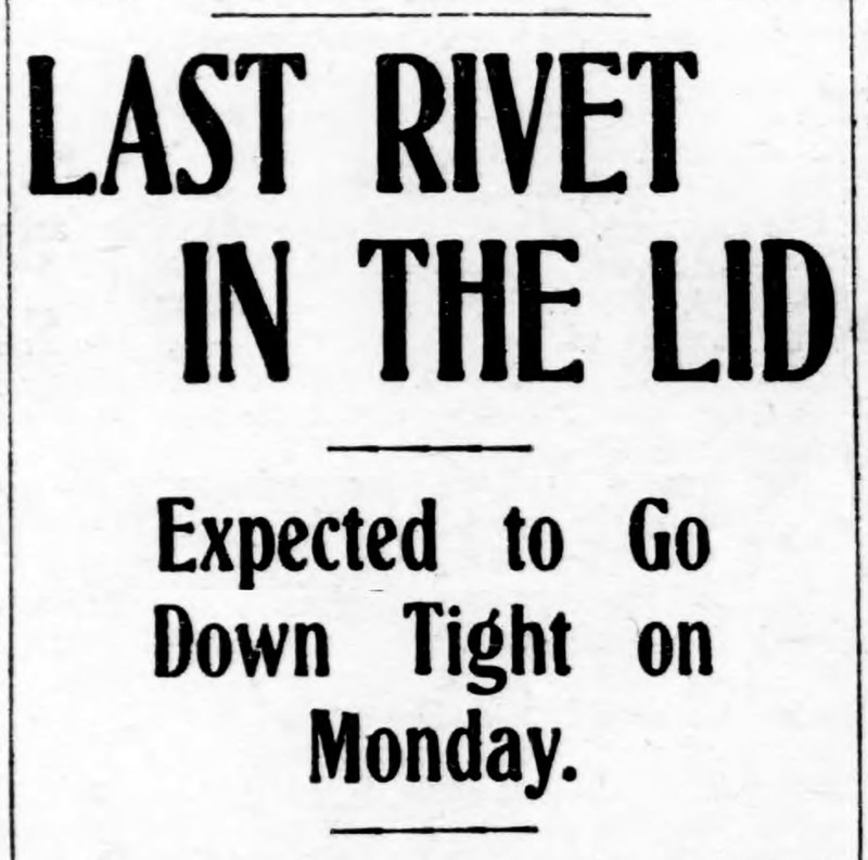 "Last rivet in the lid expected to go down tight on Monday."  From the Duluth Evening Herald, 1908.
