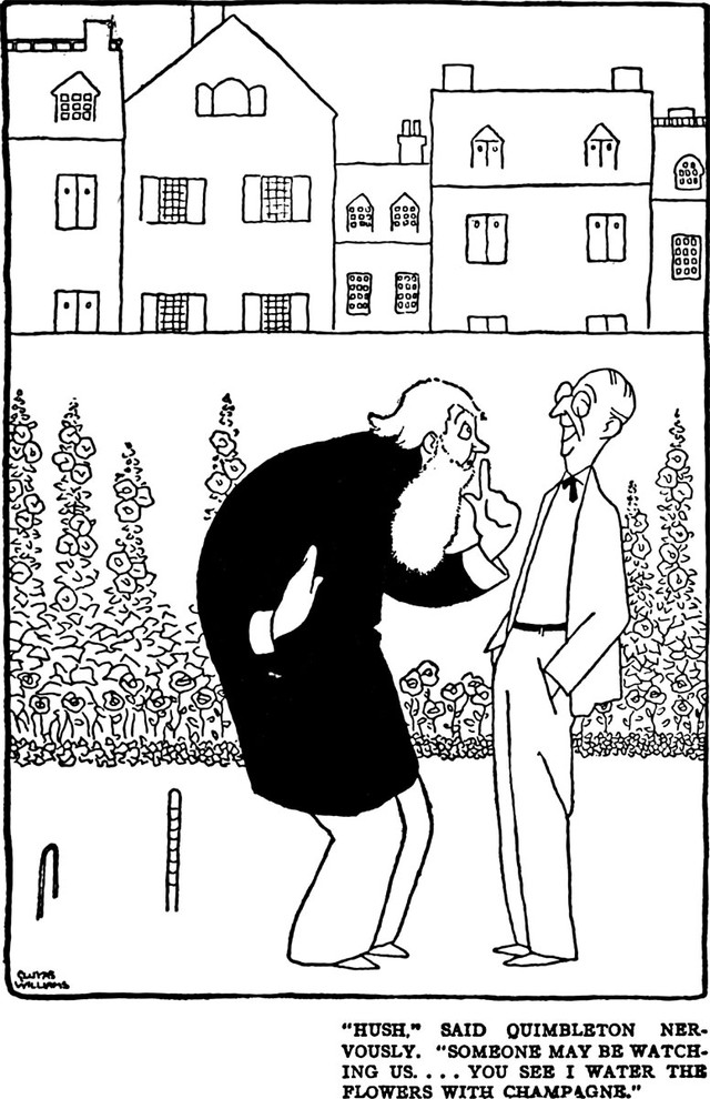 In the Sweet and Dry by Christopher Morley and Bart Haley (1919), illustrated by Gluyas Williams. The caption reads: "'Hush,' said Quimbleton nervously. 'Someone may be watching us. ... You see I water the flowers with champagne.'"