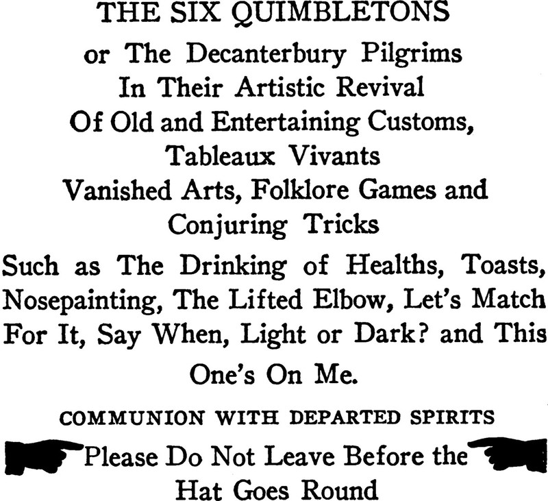 In the Sweet and Dry by Christopher Morley and Bart Haley (1919), illustrated by Gluyas Williams. The caption reads: "The Six Quimbletons or The Decanterbury Pilgrims In Their Artistic Revival Of Old and Entertaining Customs, Tableaux Vivants, Vanished Arts, Folklore Games and Conjuring Tricks Such as The Drinking of Healths, Toasts, Nosepainting, The Lifted Elbow, Let's Match For It, Say When, Light or Dark? and this One's On Me. Communion With Departed Spirits. Please Do Not Leave Before the Hat Goes Round."