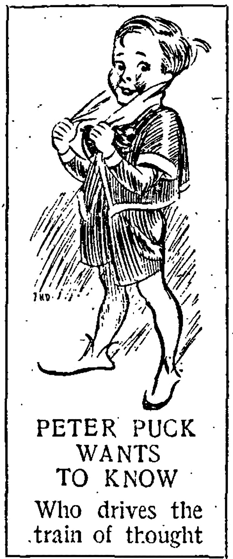 "Peter Puck wants to know who drives the train of thought."  From The Children's Newspaper, 1924.