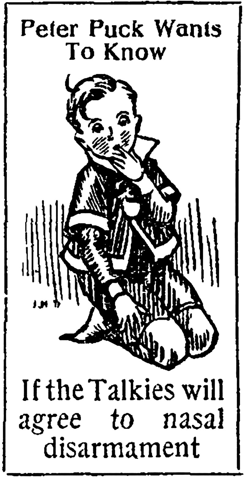 "Peter Puck wants to know if the talkies will agree to nasal disarmament."  From The Children's Newspaper, 1929.