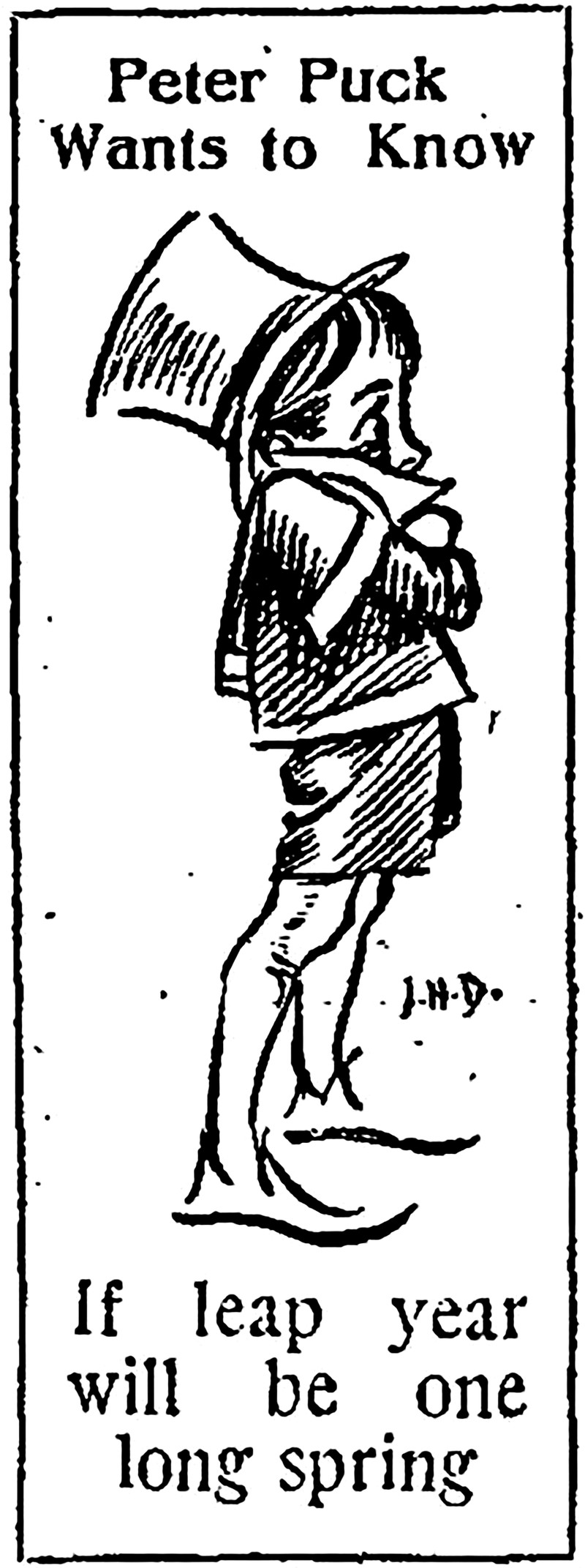 "Peter Puck wants to know if leap year will be one long spring."  From The Children's Newspaper, 1928.