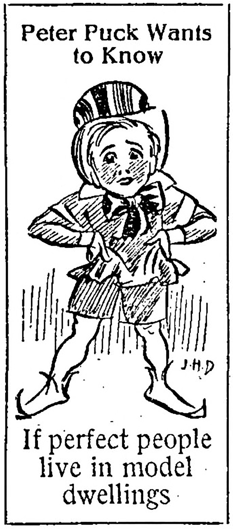 "Peter Puck wants to know if perfect people live in model dwellings."  From The Children's Newspaper, 1927.